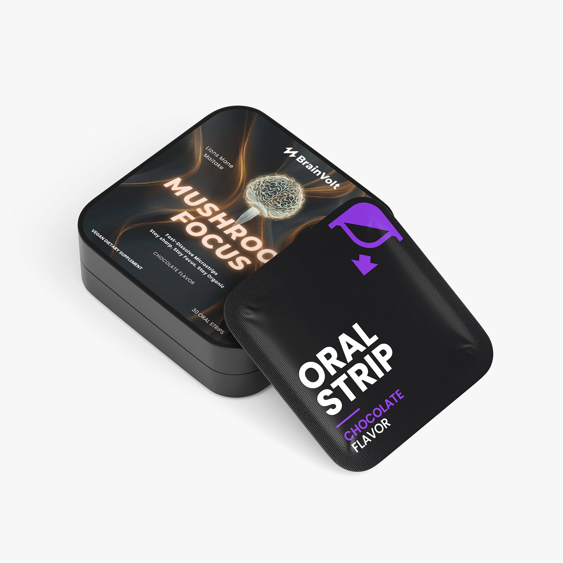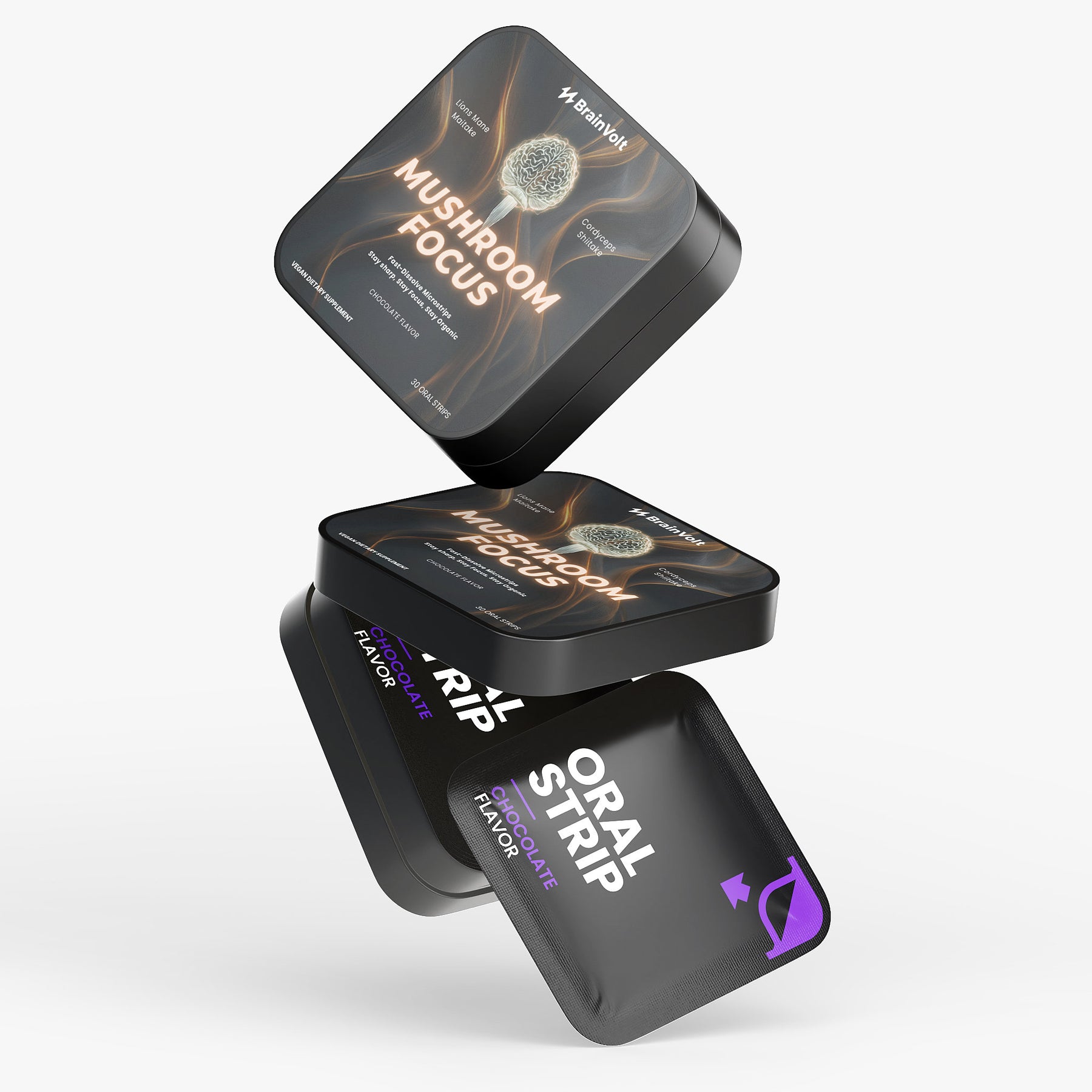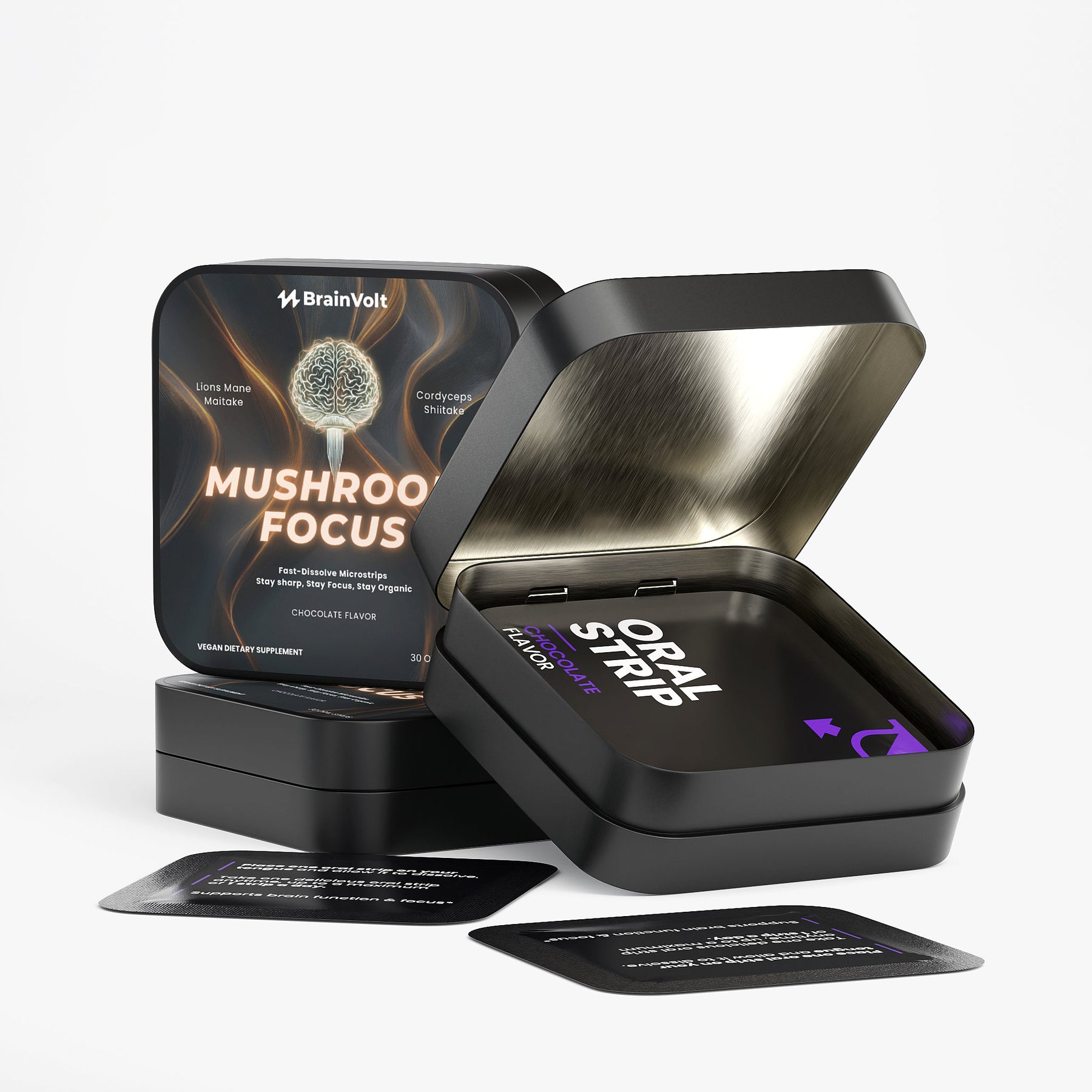 Mushroom Focus Strips are dissolvable oral strips made with functional mushroom extracts designed to support mental clarity, focus, and overall wellness — all in a convenient, chocolate-flavored strip.
